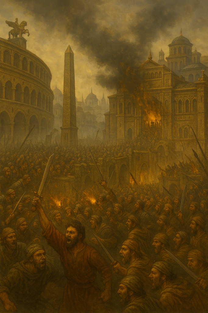 15. siječnja 532. je napeta i ljutita svjetina došla na carigradski hipodrom gledati utrke. Hipodrom se nalazio do carskih palača, pa je Justinijan utrke mogao promatrati iz sigurnosti svoje lože u palači. Od početka je svjetina izvikivala uvrede upućene Justinijanu. Do kraja dana, na trci 22, raznoliki nepravilni povici su se promijenili iz “Plavi!” ili “Zeleni!” u jedinstveno “Nίκα!” (“Pobijedi!” ili “Pokori!”), a svjetina je provalila i napala carske palače.